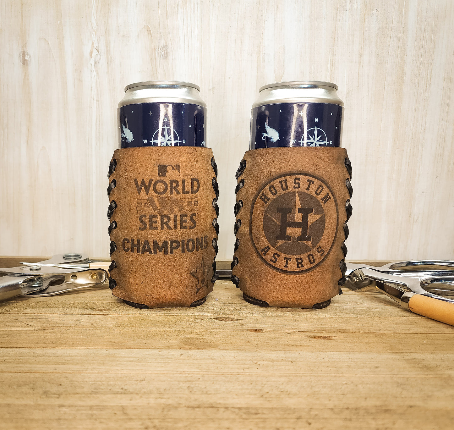 These premium cozies may be designed with any personalization including logos or sayings and will be laser engraved into oil-tanned premium leather, which ensures your personalization is highly detailed and won't rub off. I then hand lace each sleeve with center cut leather lace and finish with leather treatment.