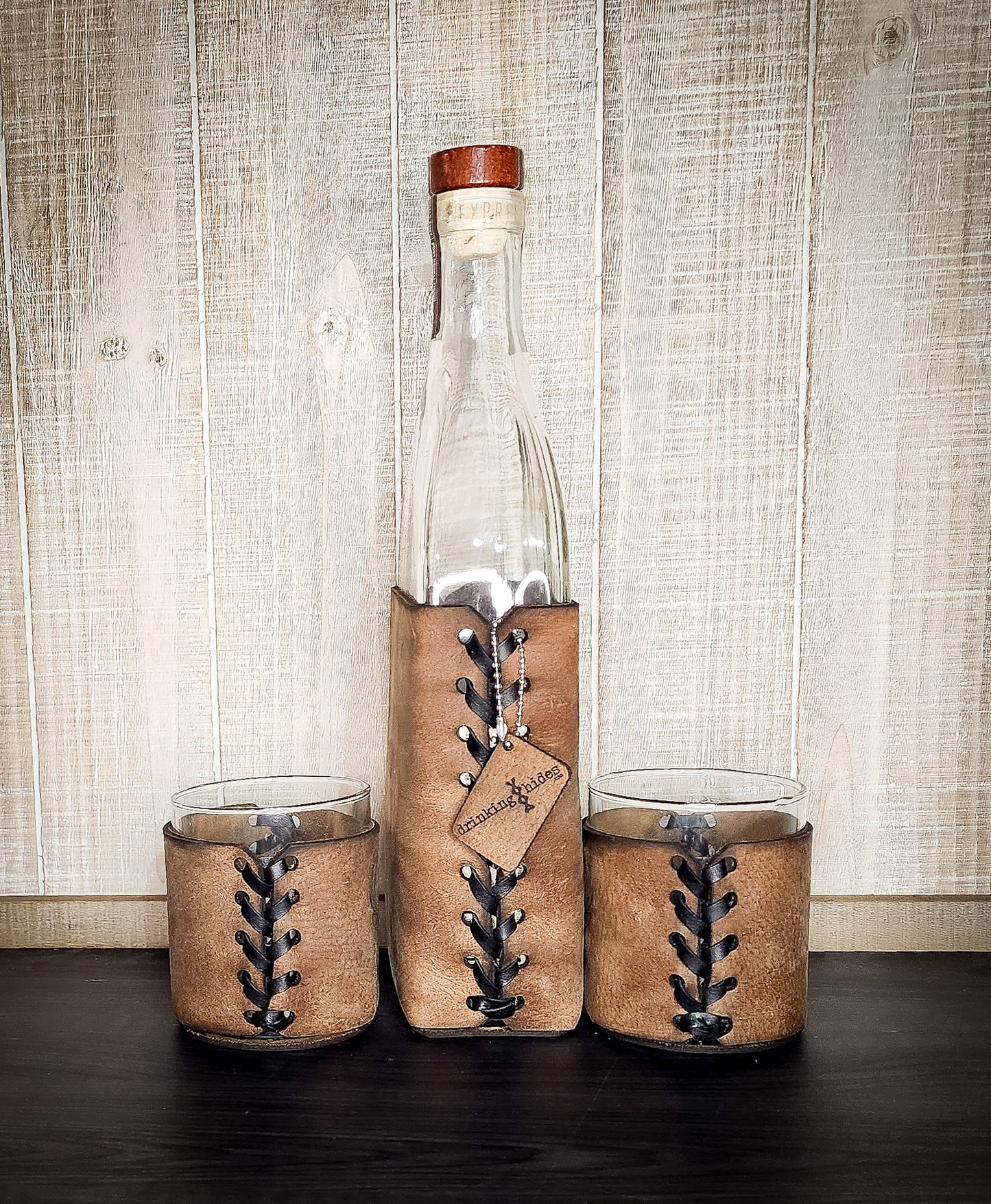 I will send you a proof before I make your leather sleeve to ensure that your design is exactly what you were looking for. *Actual whiskey glasses are included and also wrapped in leather. *Liquor bottles can be 750 ML or smaller in size.
