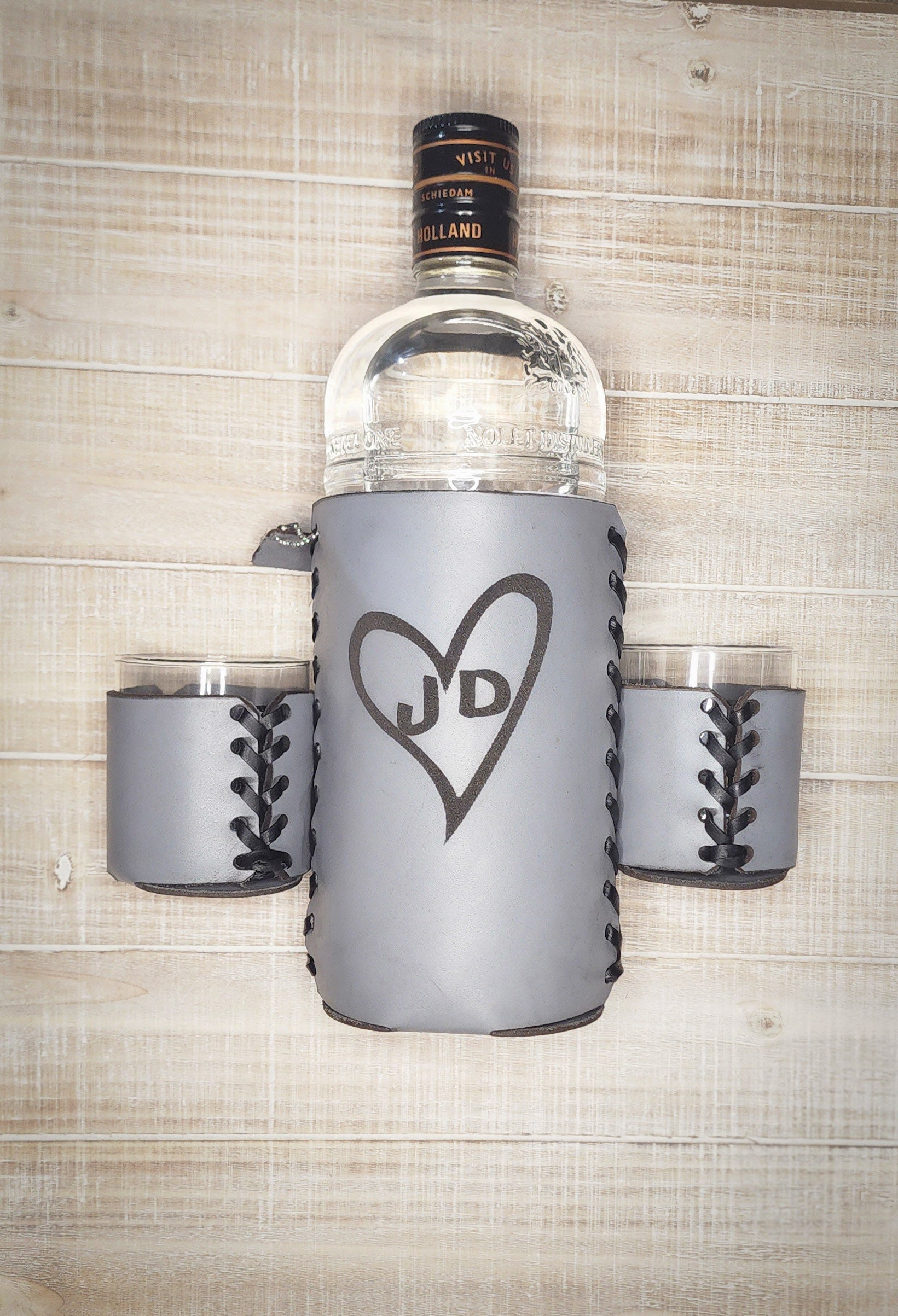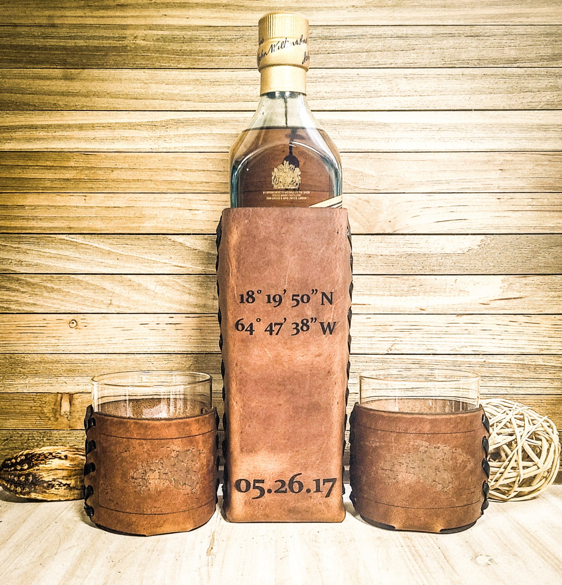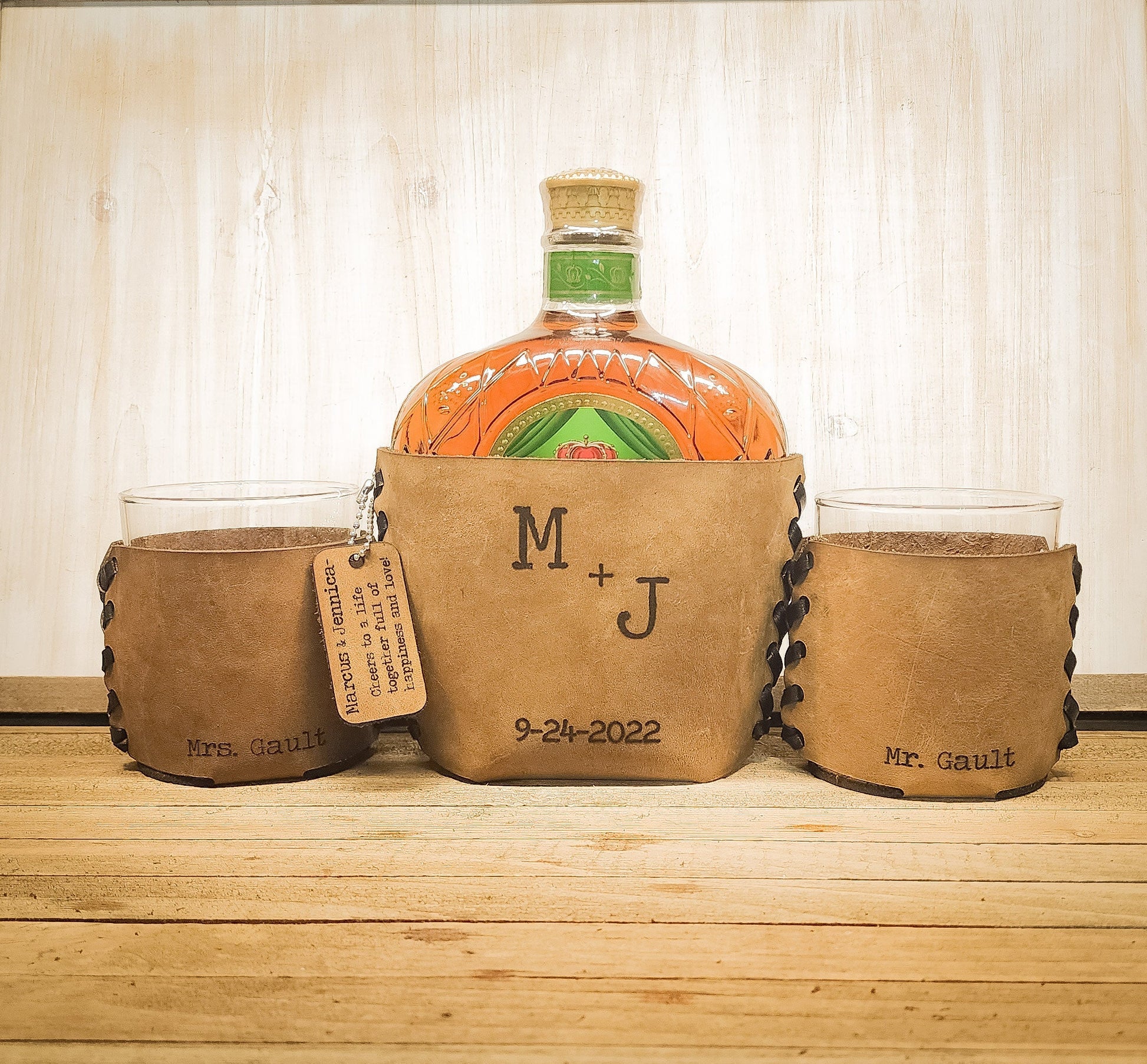 Crush this Christmas gifts this year with a custom made leather whiskey set. This whiskey set is handmade out of premium oil tanned leather and includes one wrap custom fit to the liquor bottle of your choice. You can also choose to include leather wrapped with glasses that can also include you personalization. The actual glasses are included and wrapped in leather.